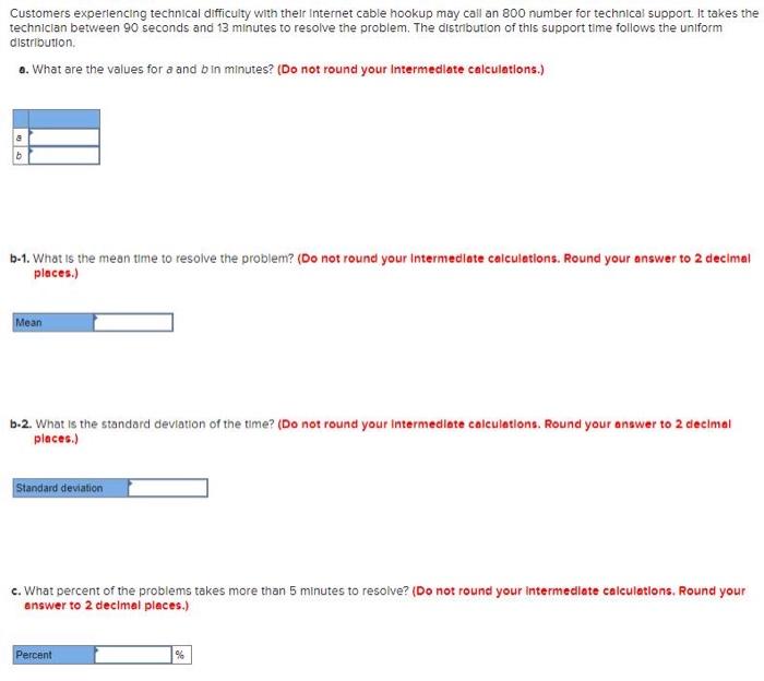 Customers experiencing technical difficulty with their internet cable hookup may call an 800 number for technical support. What are the values for a and b in minutes. Do not round your intermediate.